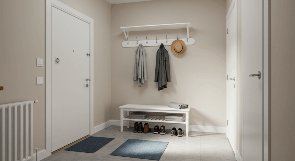 玄関とリビングの境目の壁に家族分のフックを設置すれば、カギや名札、マスクなど「すぐに取りたいもの」がすっきり並びます。子どもも自分の場所を覚えやすくなり、習慣化にも◎。