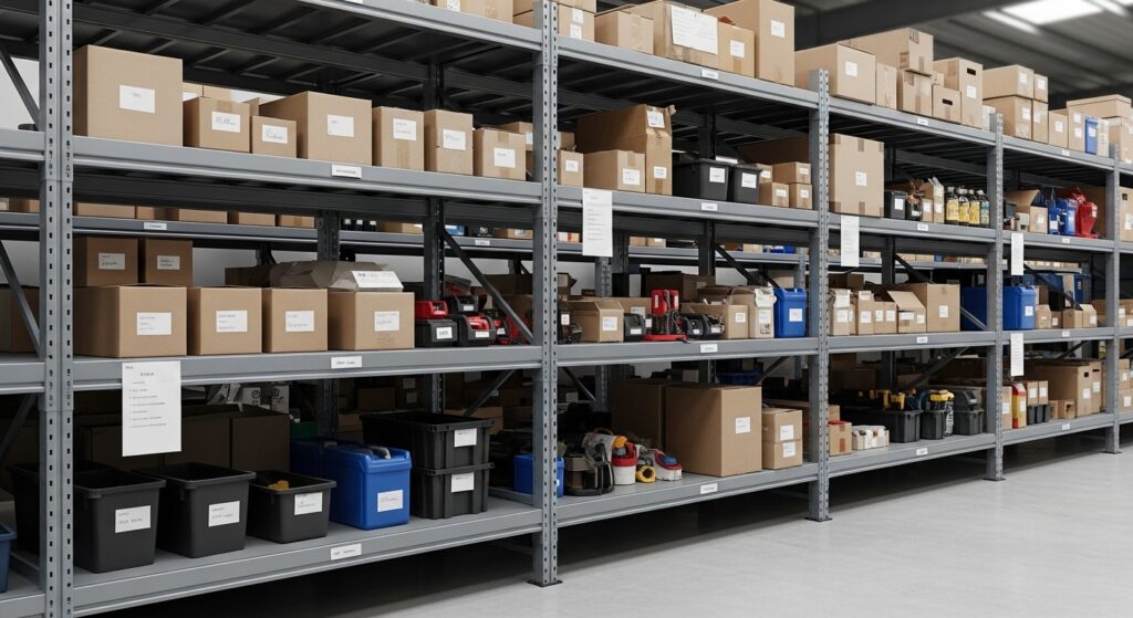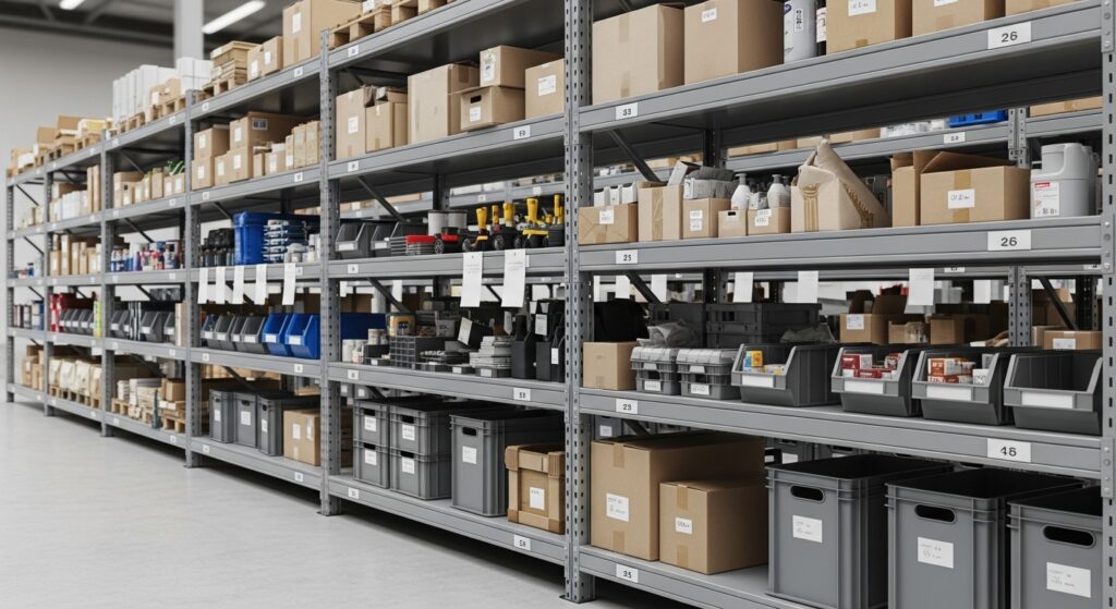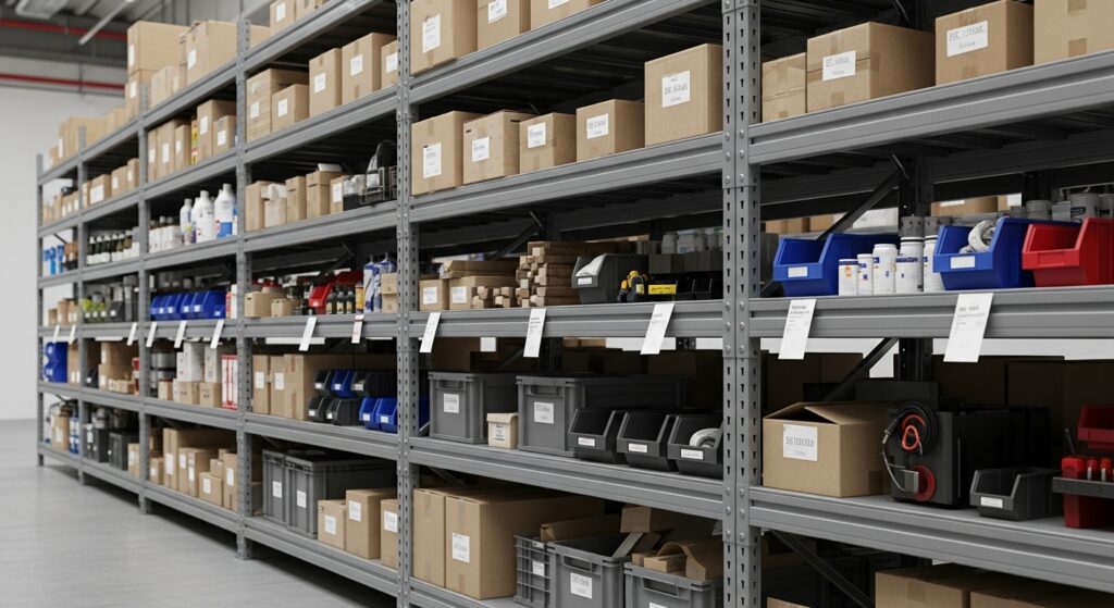 オフィスや工場、倉庫などでよく使われるスチール棚。